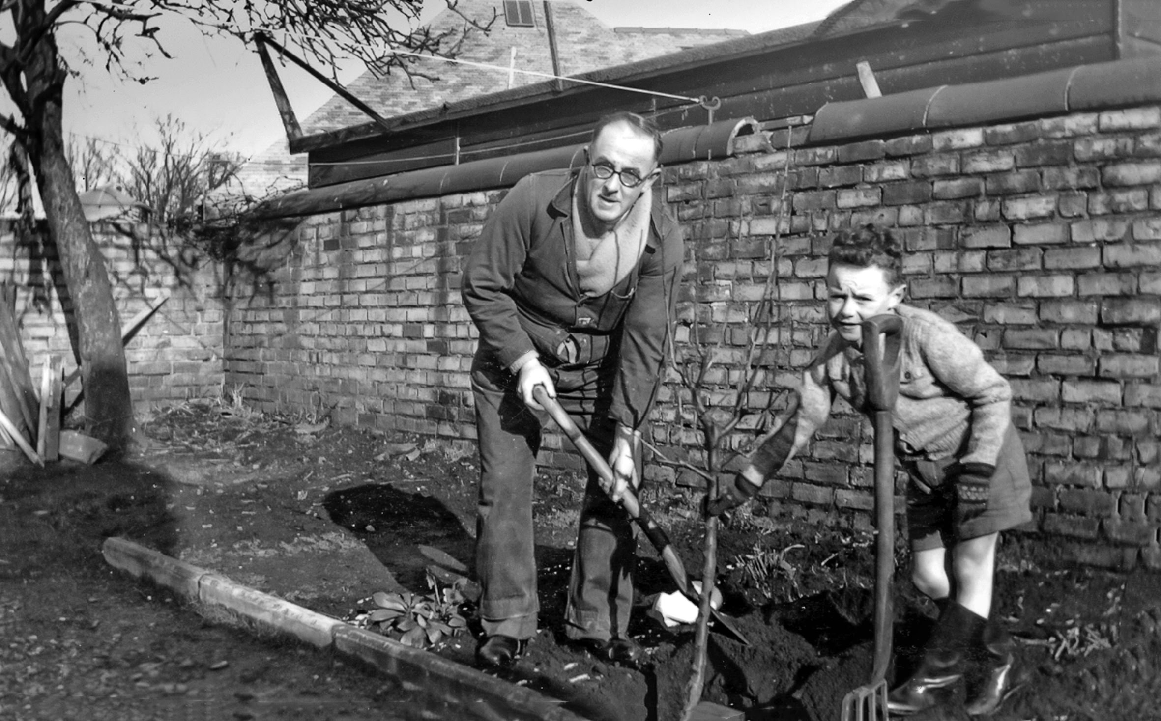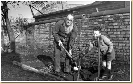 Father and Neil plant an apple tree February 1955
